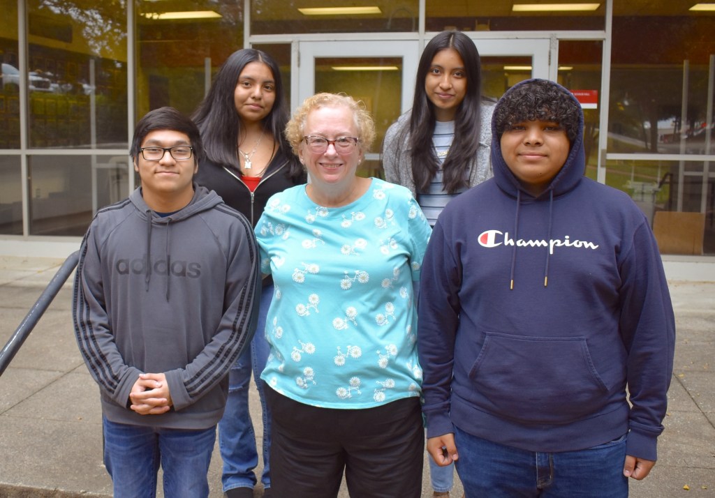 Students from Hobbton High School visit NC State’s Department of Food, Bioprocessing and Nutrition Science in Raleigh on Wednesday, October 26. They are, front row, Luis Perez, Mary Kim Davis (teacher), and Joshua Blanco; back row, Monserret Hernandez, and Karen Anzures.
